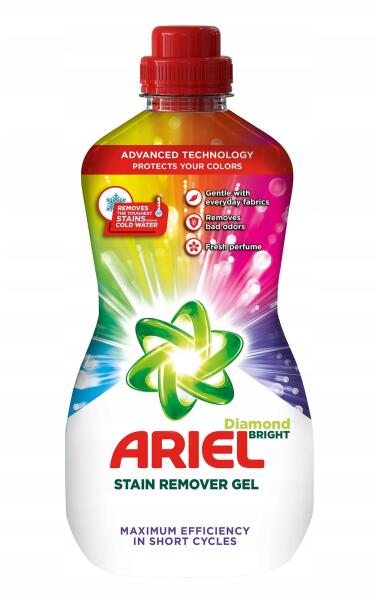 Ariel Diamond Bright Stain Remover Color Gel Folteltávolító Gél Színes Ruhákhoz 950ml Hatékony folteltávolítás a színek védelmével Az Ariel Diamond Bright Stain Remover Color Gel tökéletes választás, ha makacs foltokkal küzd, de szeretné megőrizni ruhái élénk színeit. Magas koncentrációjú formulájának köszönhetően gyorsan feloldódik, és mélyen behatol a textilszálak közé, hogy a legnehezebben eltávolítható szennyeződésekkel is elbánjon. Főbb jellemzők és előnyök Erőteljes folteltávolítás – Már az első mosás alkalmával eltünteti a friss és beszáradt foltokat.